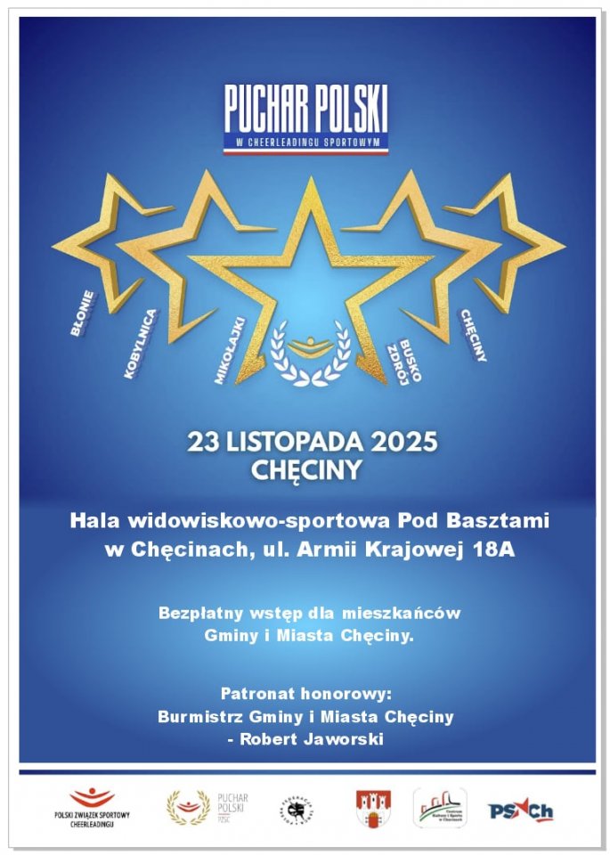 W najbliższą niedzielę 23 listopada 2025 r. w hali widowiskowo-sportowej „Pod Basztami” odbędzie się Puchar Polski w Cheerleadingu Sportowym. Patronat honorowy nad wydarzeniem objął burmistrz Gminy i Miasta Chęciny, Robert Jaworski. Organizatorem wydarzenia jest Polski Związek Sportowy Cheerleadingu.