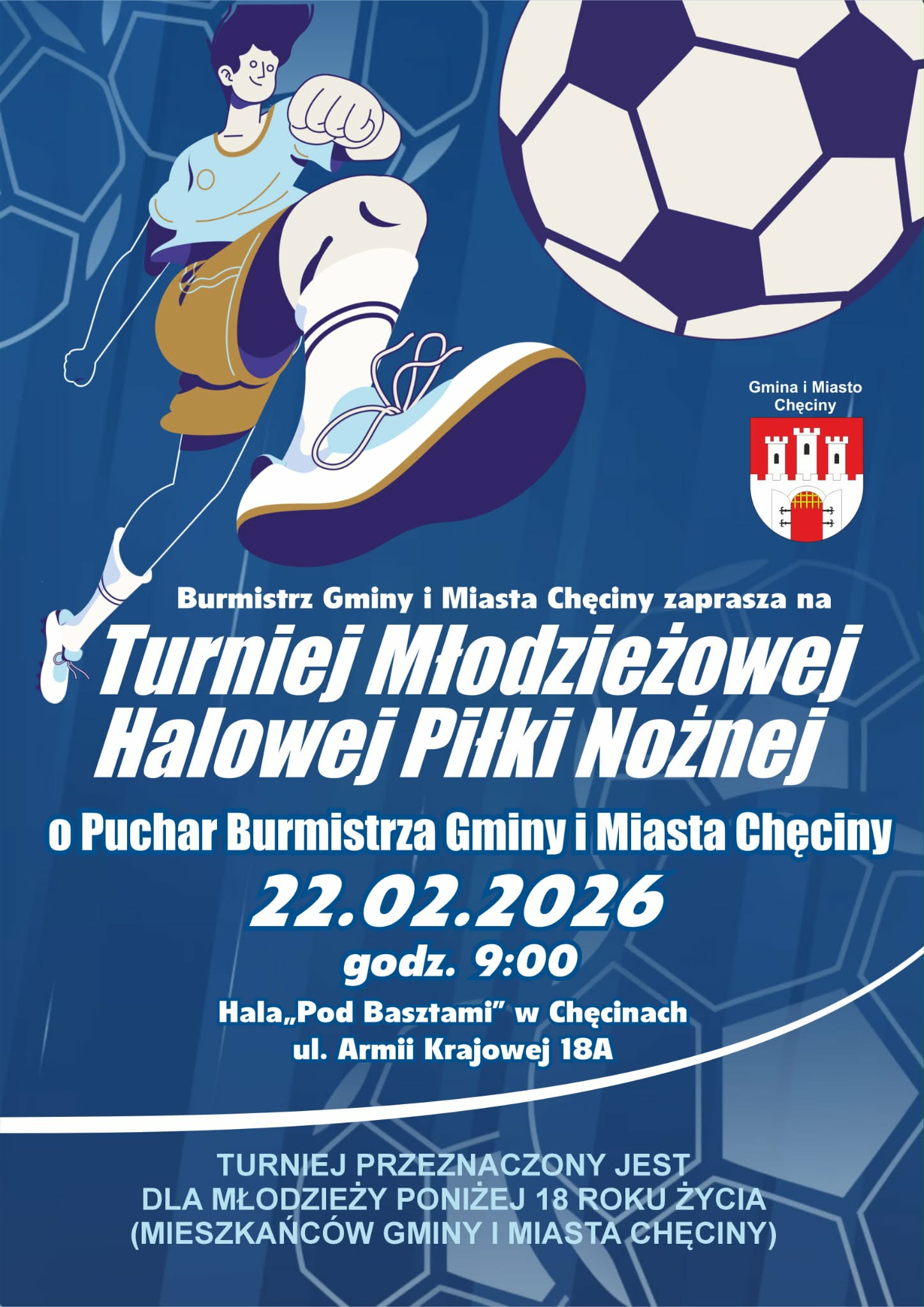 Burmistrz Gminy i Miasta Chęciny zaprasza na Turniej Młodzieżowej Halowej Piłki Nożnej o Puchar Burmistrza Gminy i Miasta Chęciny, który odbędzie się 22 lutego 2026 r. o godz. 9:00 w Hali „Pod Basztami” w Chęcinach (ul. Armii Krajowej 18A).