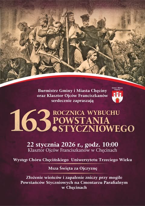 Burmistrz Gminy i Miasta Chęciny Robert Jaworski oraz Klasztor Ojców Franciszkanów w Chęcinach zapraszają do udziału w uroczystościach patriotyczno-religijnych z okazji 163. rocznicy wybuchu powstania styczniowego.